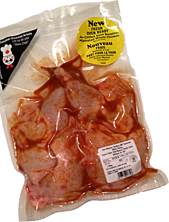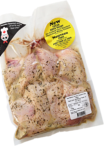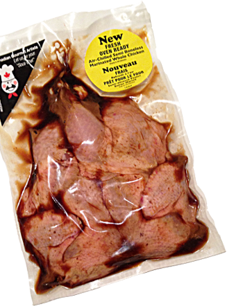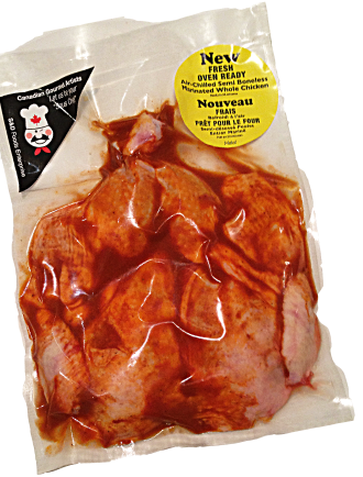 Wing and leg bones remain for added taste. Simply open the package and roast or grill chicken along with marinade. Halal.